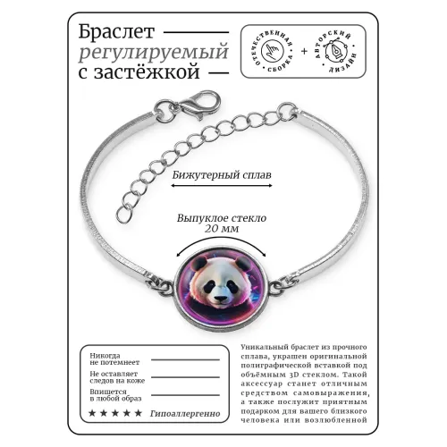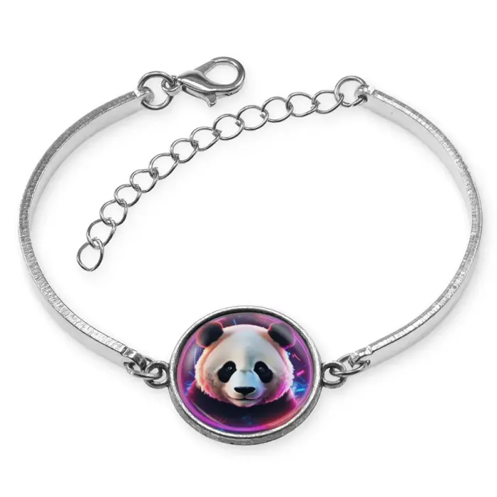 Металлический браслет-сувенир с изображением панды в неоновых тонах под стеклянной линзой.