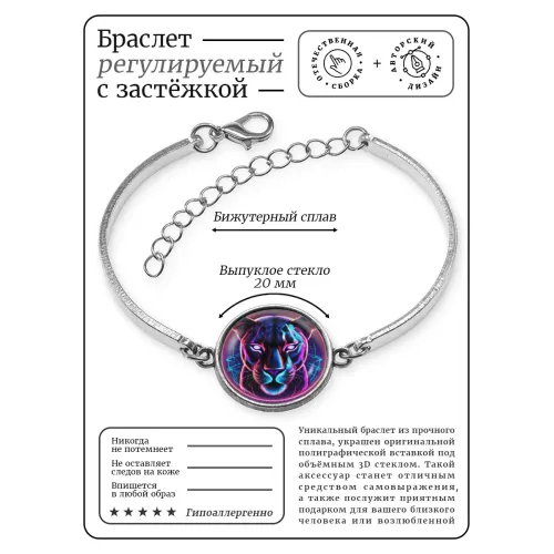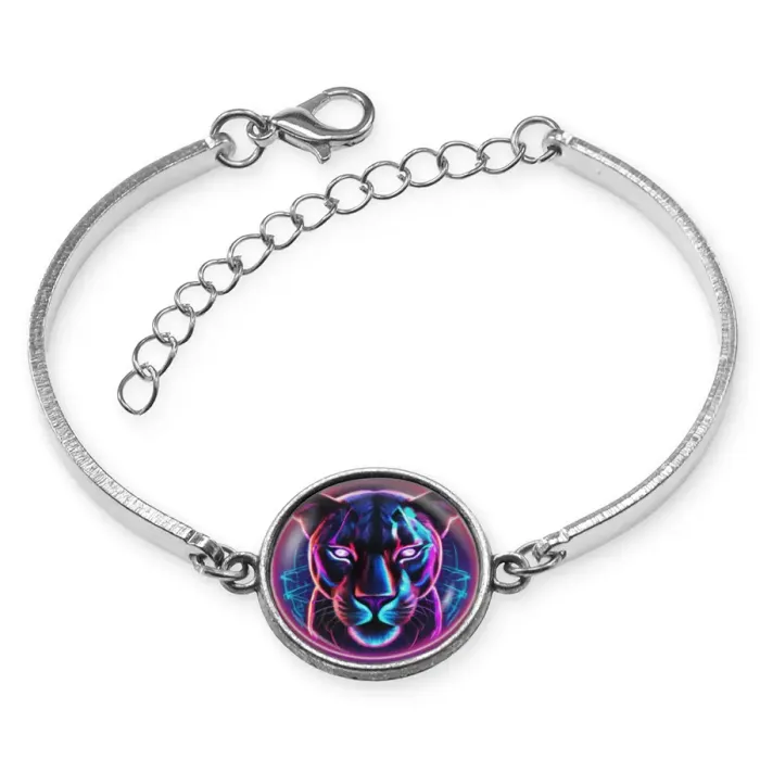 Браслет из бижутерного сплава с декоративным элементом «Дикая кошка» под выпуклой стеклянной линзой.