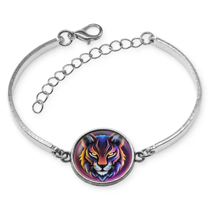 Металлический браслет с изображением рыси под стеклянной линзой.