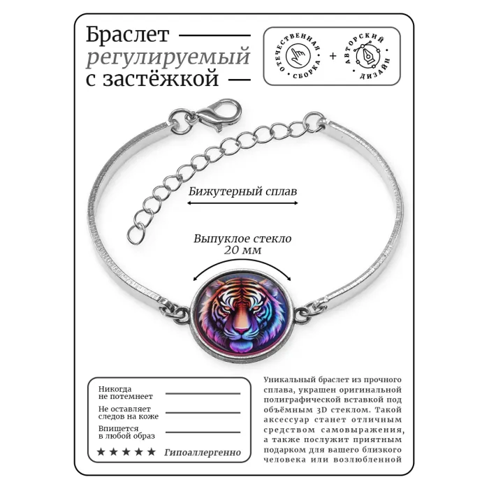 Металлический браслет с декоративным элементом в виде тигра. Изображение защищено выпуклой стеклянной линзой.
