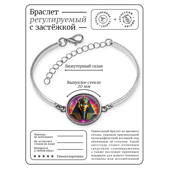 Браслет металлический Фараон неон — это стильный аксессуар, который добавит ярких красок в любой образ. Изготовленный из бижутерного сплава, он отличается прочностью и долговечностью. Регулируемая по длине застёжка обеспечивает комфортную посадку на запястье. Изображение диаметром 18 мм защищено выпуклой стеклянной линзой, что придаёт изделию особую выразительность. Упакован в прозрачный пакет, что делает его отличным вариантом для подарка или личного использования.