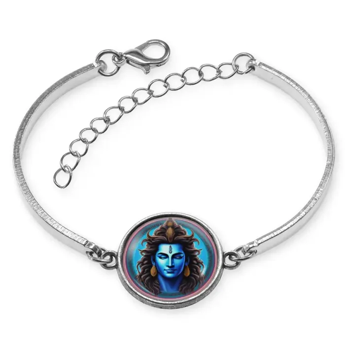 Металлический браслет с изображением Шива и неоновым эффектом. Основной элемент — изображение диаметром 18 мм под выпуклой стеклянной линзой.