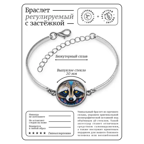 Размеры и комплектация: Регулируемая застёжка. Упаковка: прозрачный пакет.