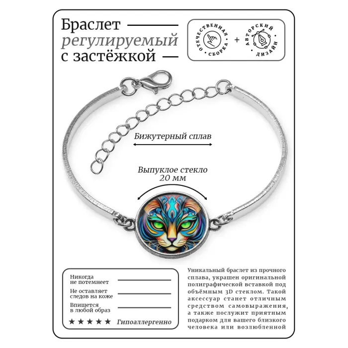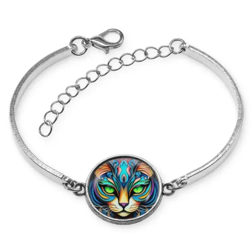 Металлический браслет-сувенир с изображением кошки под стеклянной линзой.