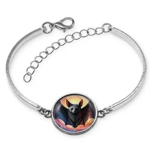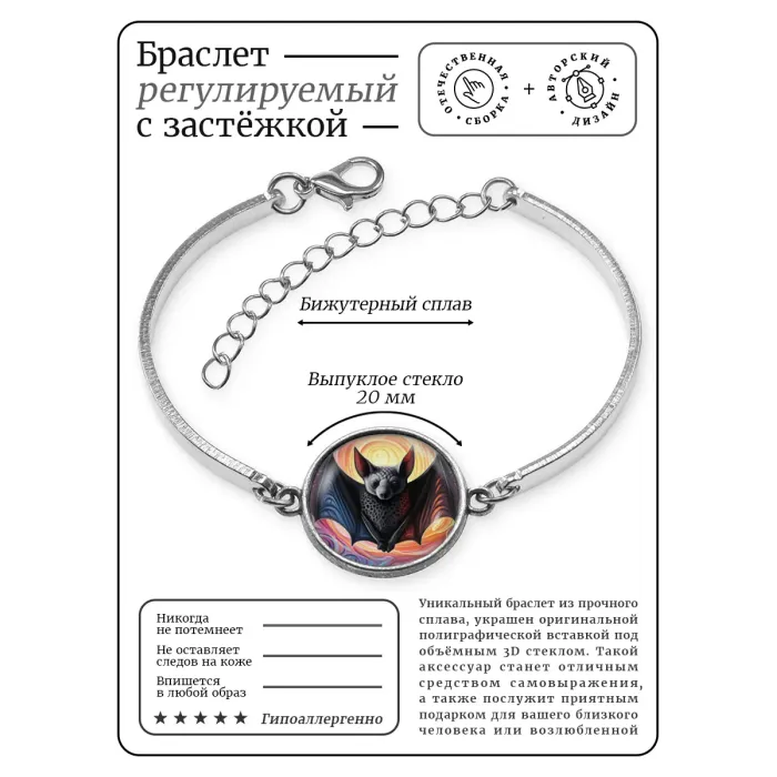 Бижутерный браслет с декоративным элементом в виде летучей мыши под стеклянной линзой. Застёжка регулируемая.