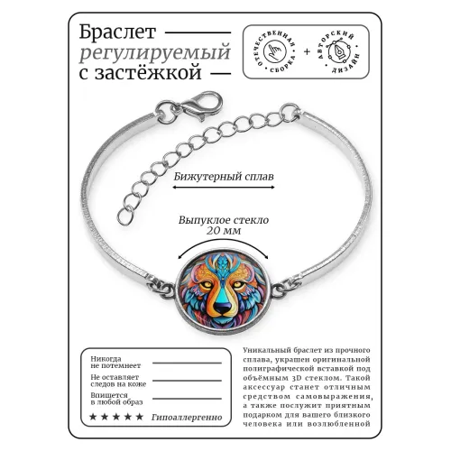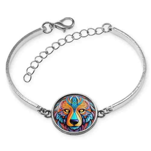 Металлический браслет с декоративным элементом в виде медведя. Изображение защищено выпуклой стеклянной линзой.