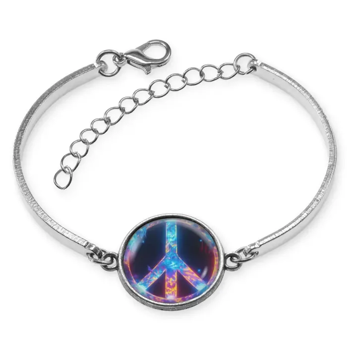 Металлический браслет с декоративным элементом в виде символа пацифик.