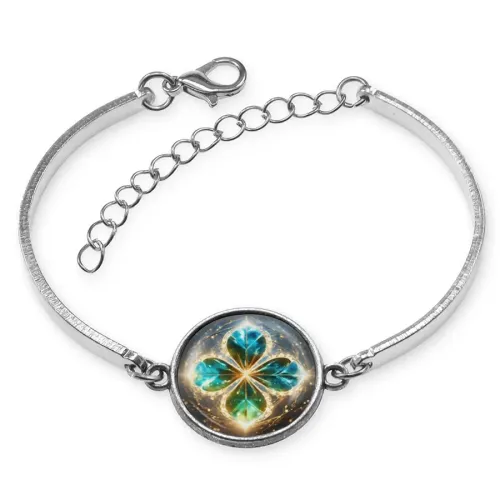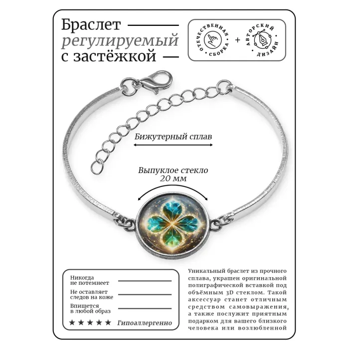 Браслет из бижутерного сплава с регулируемой застёжкой. В центре расположено изображение под выпуклой стеклянной линзой.
