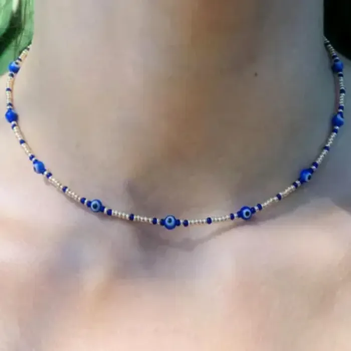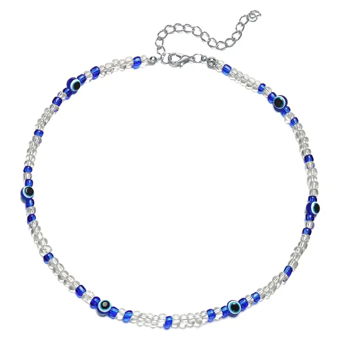 Колье от сглаза — сувенирный аксессуар из металла с покрытием под серебро и лески, с вставками из бисера и стекла. Замок типа «лобстер».