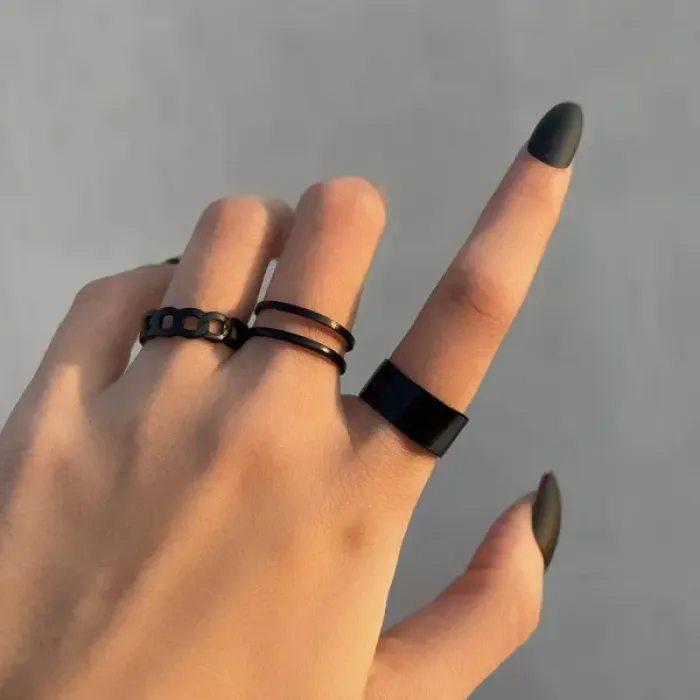 Набор из трёх безразмерных колец для носки. Материал — бижутерный сплав, цвет чёрный.
