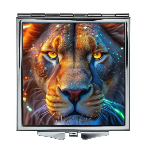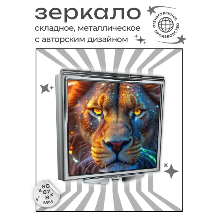 Складное зеркало квадратной формы с изображением льва. Изготовлено из металла и стекла.