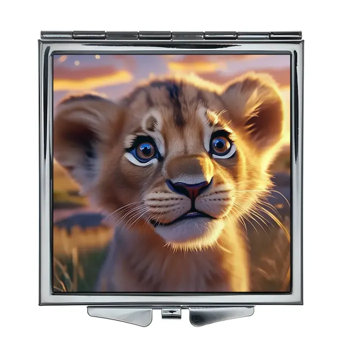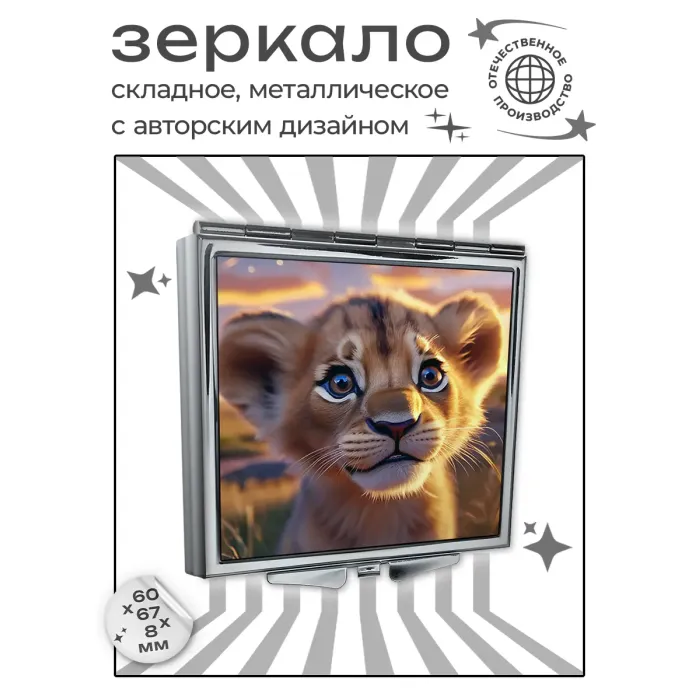 Складное зеркало квадратной формы с изображением львёнка. Изготовлено из металла и стекла.