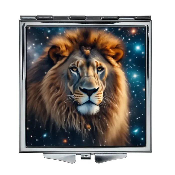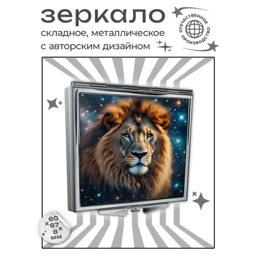 Складное зеркало квадратной формы для личного использования. Материал: металл и стекло. Дизайн: изображение Льва на фоне звёздного неба.