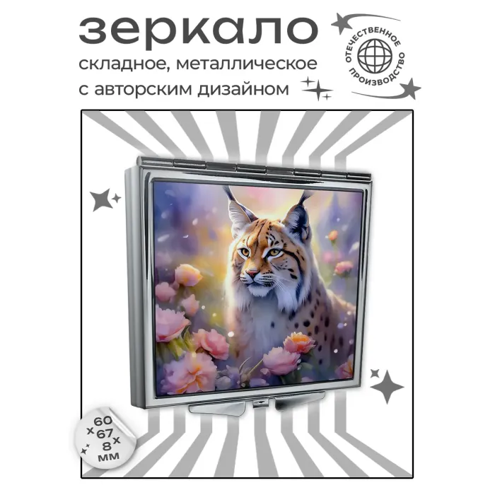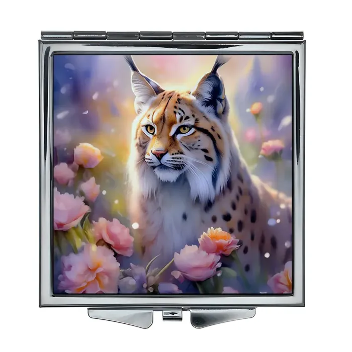 Складное квадратное зеркало для личного использования с полноцветным изображением рыси и цветов.