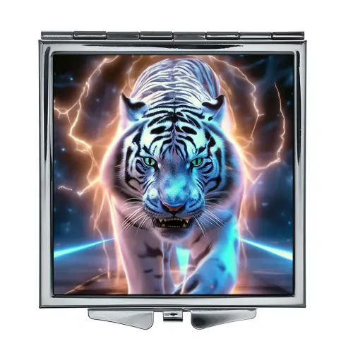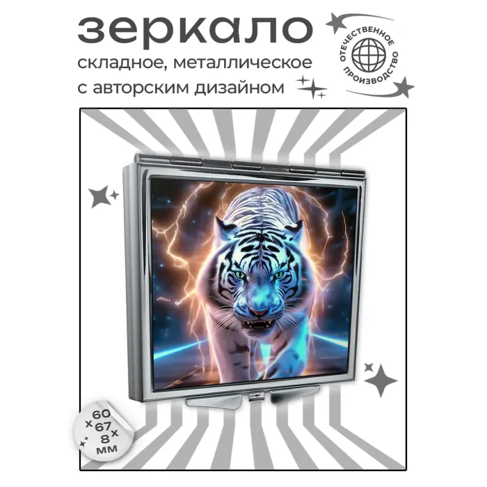 Складное зеркало квадратной формы с изображением "Молниевый тигр". Изготовлено из металла и стекла.