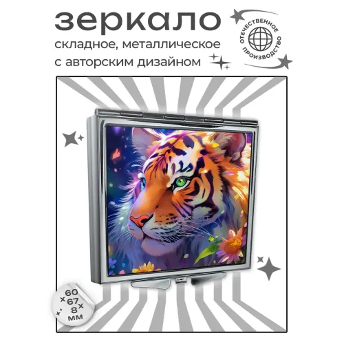 Складное квадратное зеркало с изображением тигра и цветов. Изготовлено из металла и стекла.