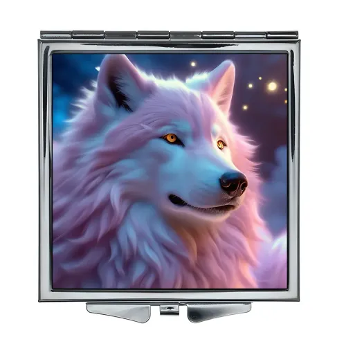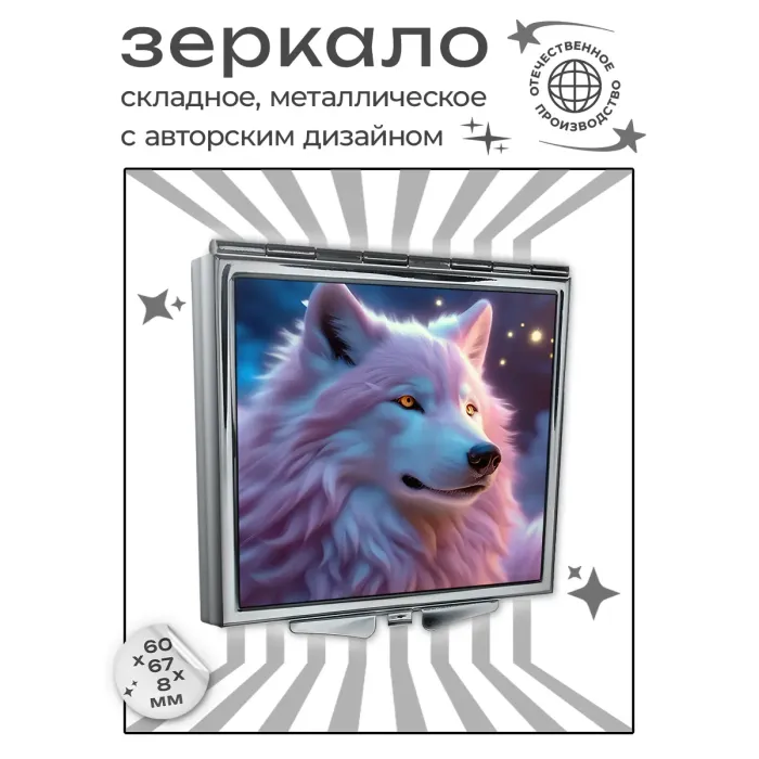 Складное зеркало квадратной формы с изображением волчицы. Материал — металл и стекло.