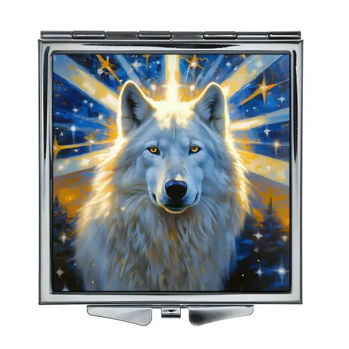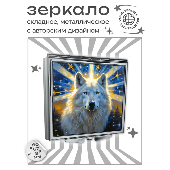 Складное квадратное зеркало с полноцветным изображением белого волка на металле.