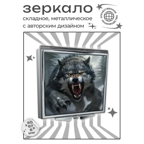 Складное квадратное зеркало с полноцветным изображением волка. Изготовлено из металла и стекла.