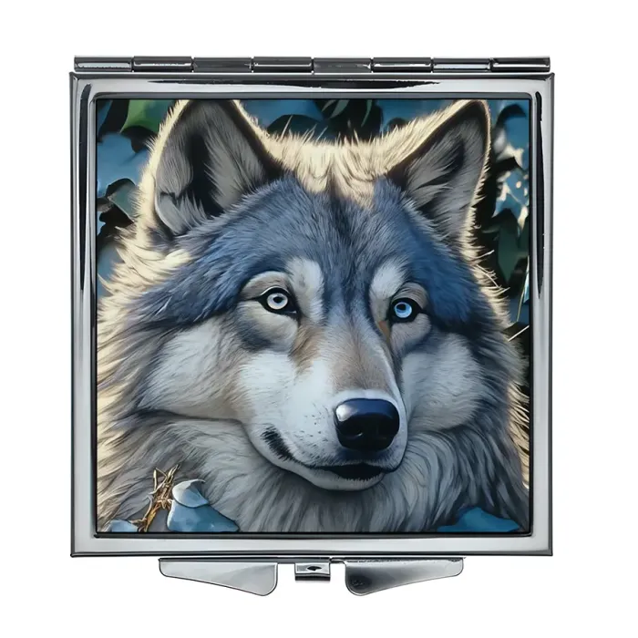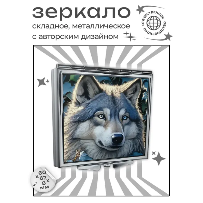 Складное зеркало квадратной формы с изображением волка. Сувенирный и практичный аксессуар.