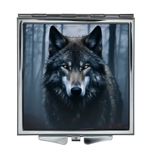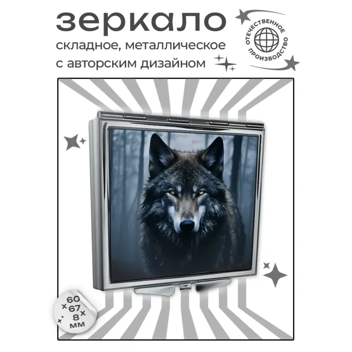 Складное зеркало квадратной формы с изображением волка. Изготовлено из металла и стекла.