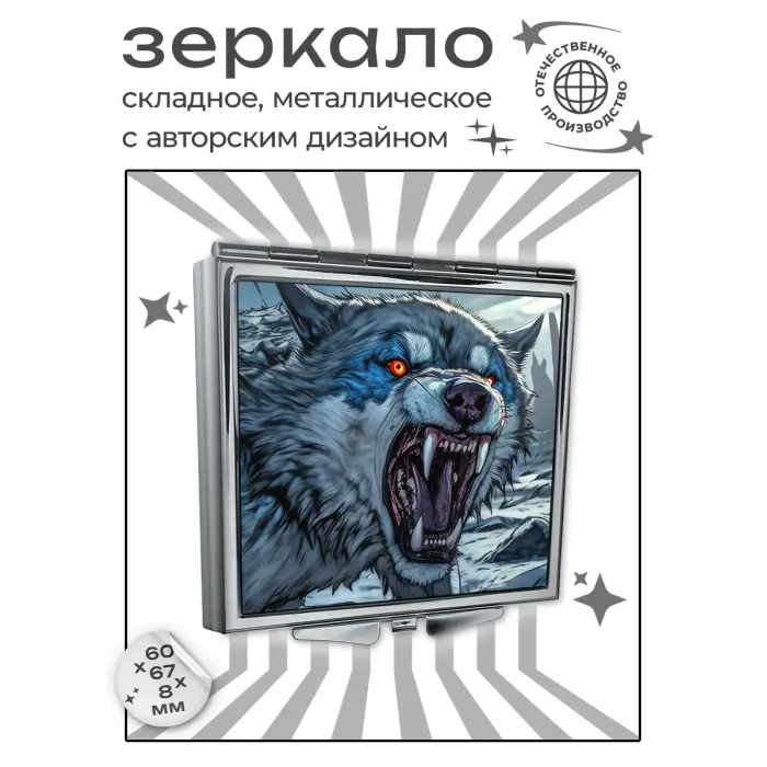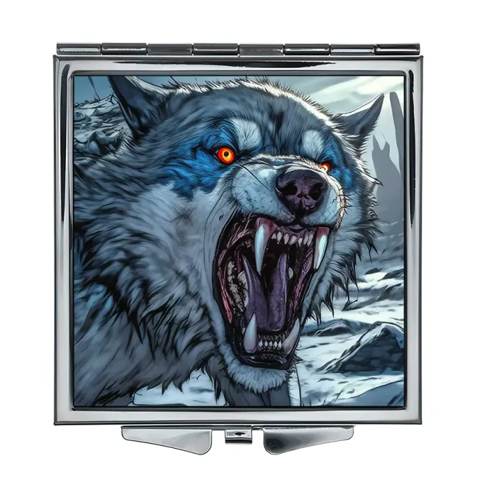 Складное зеркало квадратной формы с полноцветной печатью изображения волка на металле.