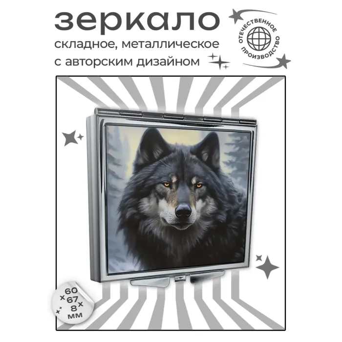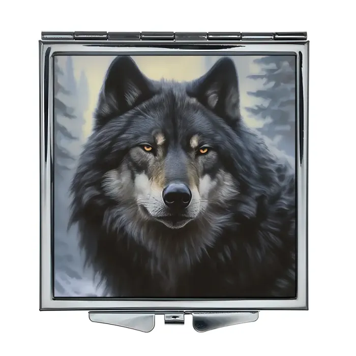 Складное зеркало квадратной формы с полноцветным изображением волка в зимнем лесу.