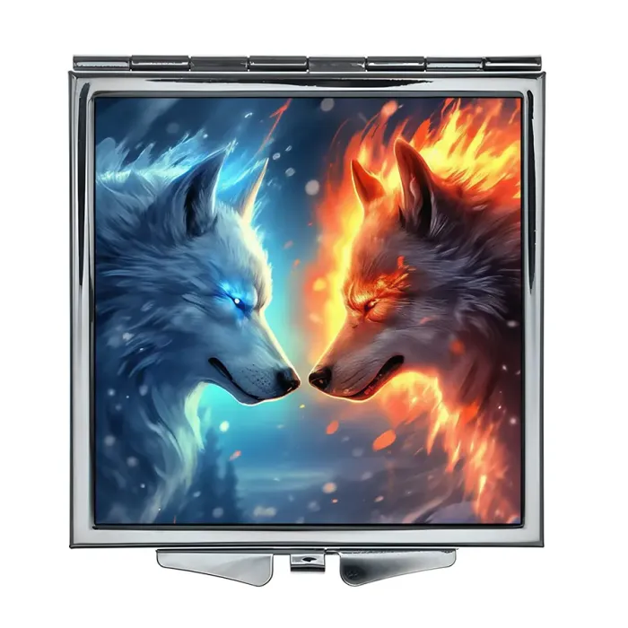 Складное квадратное зеркало с полноцветным изображением волков в тематике «лёд и пламя».