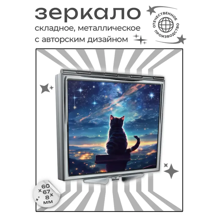 Складное зеркало квадратной формы с изображением кота, символизирующего спокойствие и умиротворение. Это изделие станет отличным подарком для любителей кошек и ценителей оригинальных аксессуаров. Зеркало выполнено из металла и стекла, размеры составляют 60х67х8 мм. Высокое качество печати обеспечивает яркость и долговечность изображения, что делает этот предмет не только функциональным, но и стильным дополнением к личной коллекции или интерьеру. Идеально подходит для использования в путешествиях или повседневной жизни.