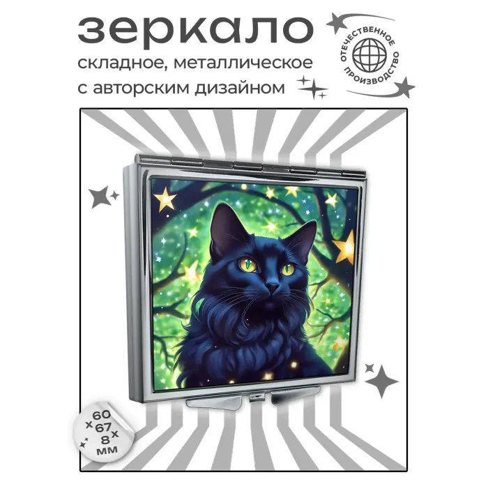 Складное зеркало квадратной формы с изображением чёрной кошки для использования в путешествиях или повседневной жизни.