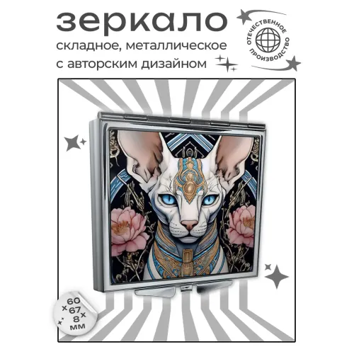 Складное квадратное зеркало с изображением кота сфинкса. Материалы: металл и стекло.