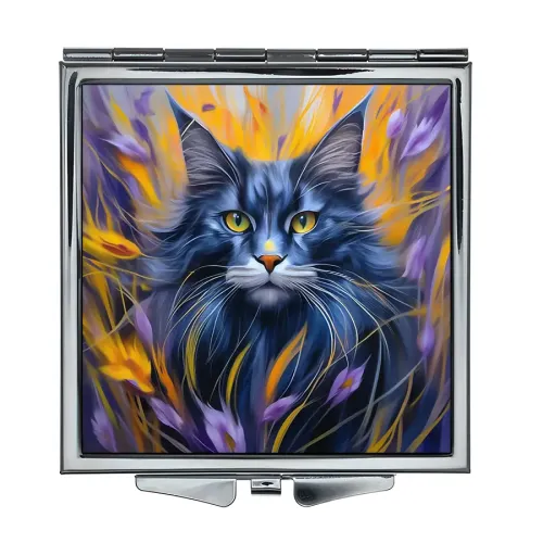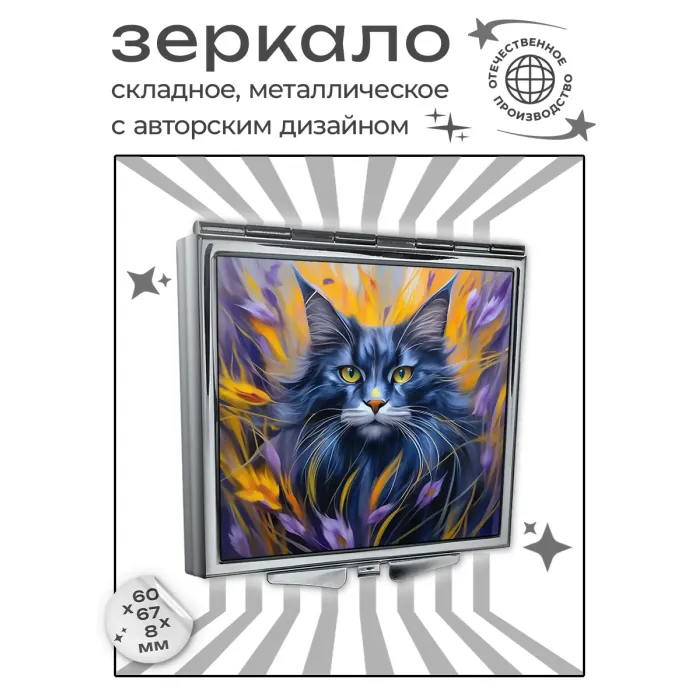 Складное квадратное зеркало с полноцветным изображением кота в поле.
