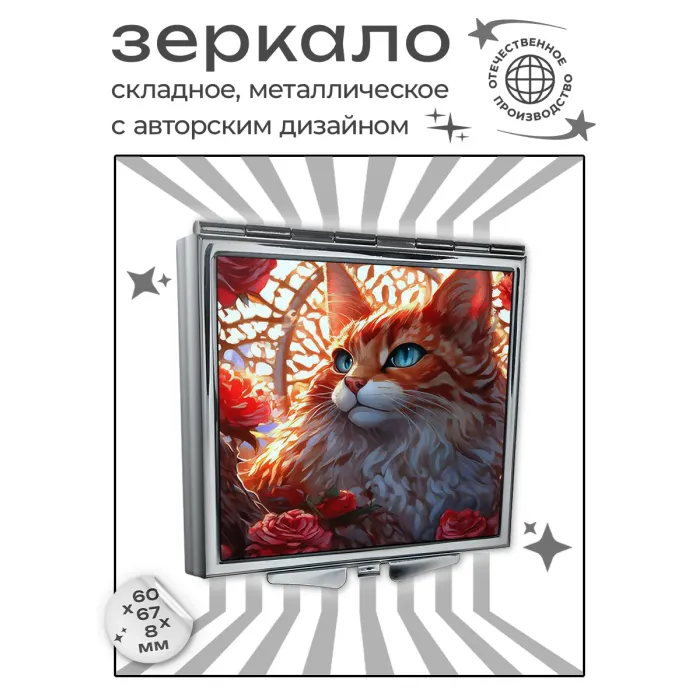 Складное зеркало квадратной формы с очаровательным изображением кошки среди цветов станет не только полезным аксессуаром, но и стильным элементом декора. Это зеркальце выполнено из качественного металла и стекла, что обеспечивает долговечность и надежность. Размер 60х67х8 мм делает его компактным для хранения в сумке или кармане. Полноцветная печать на металле гарантирует яркость и четкость изображения, добавляя оригинальности каждому моменту использования. Идеально подходит для ежедневного применения или в качестве подарка для любителей животных.
