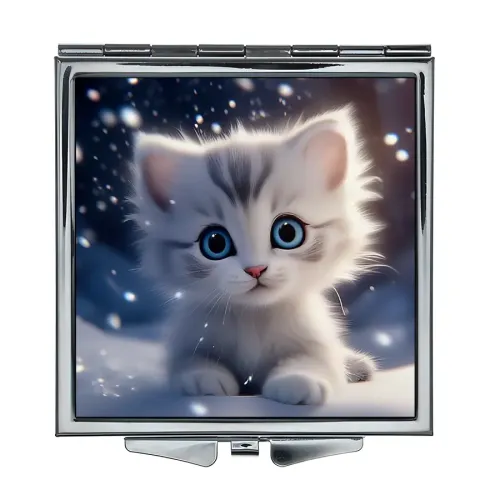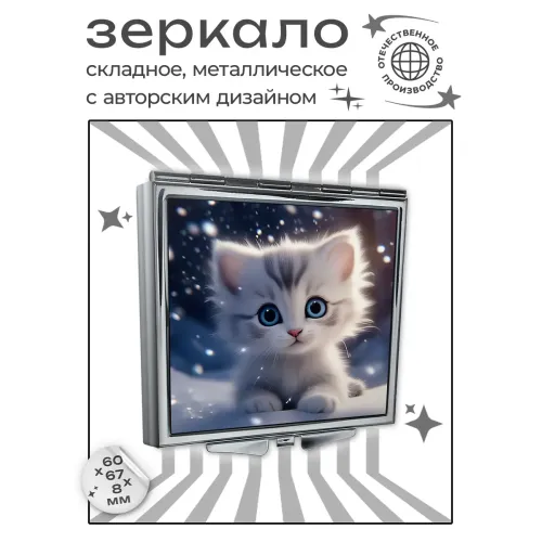 Складное зеркало квадратной формы с изображением котёнка на снегу.