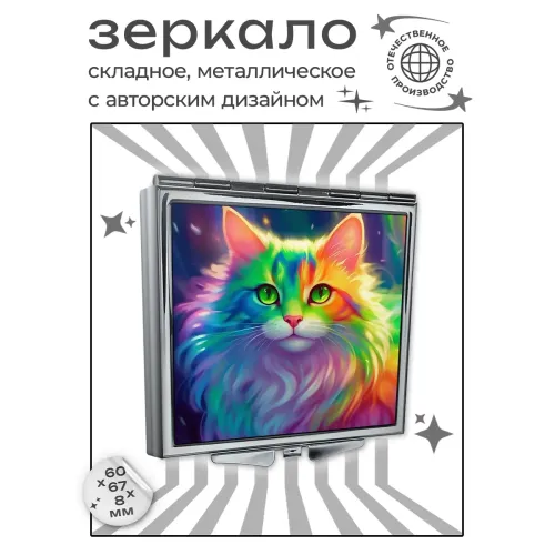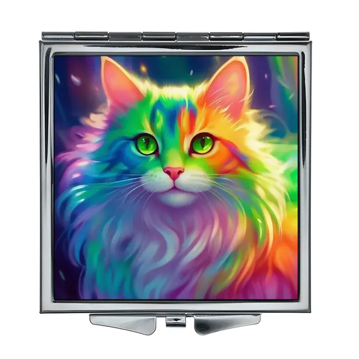Складное квадратное зеркало с полноцветным изображением радужной кошки.