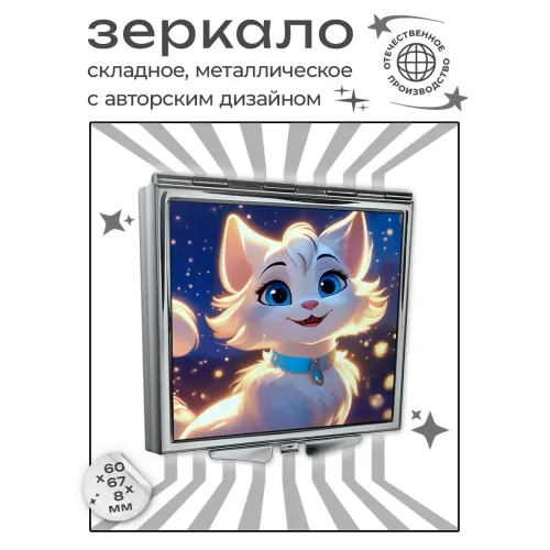 Складное зеркало квадратной формы с изображением белой кошки. Изготовлено из металла и стекла.