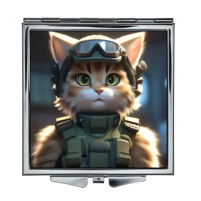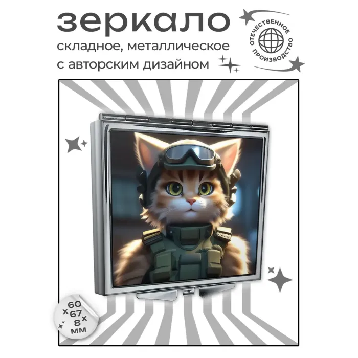 Складное зеркало квадратной формы с изображением кошки в стиле милитари.