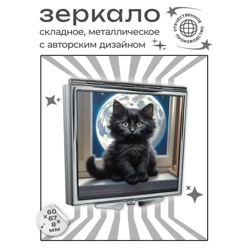 Складное квадратное зеркало с изображением черного котенка. Изготовлено из металла и стекла.