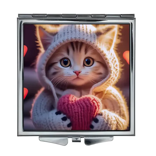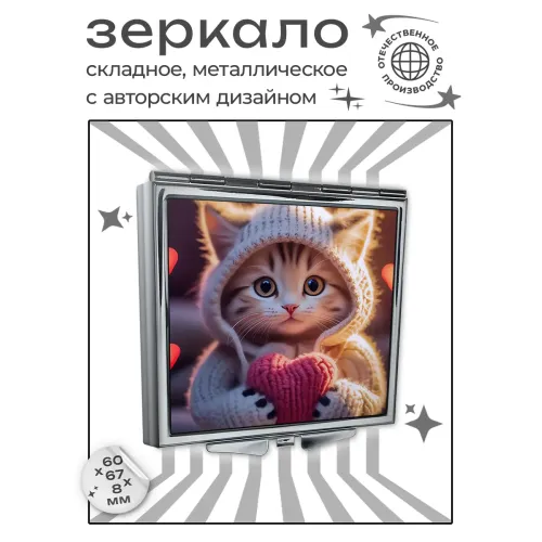 Складное зеркало квадратной формы с изображением кошки в свитере.