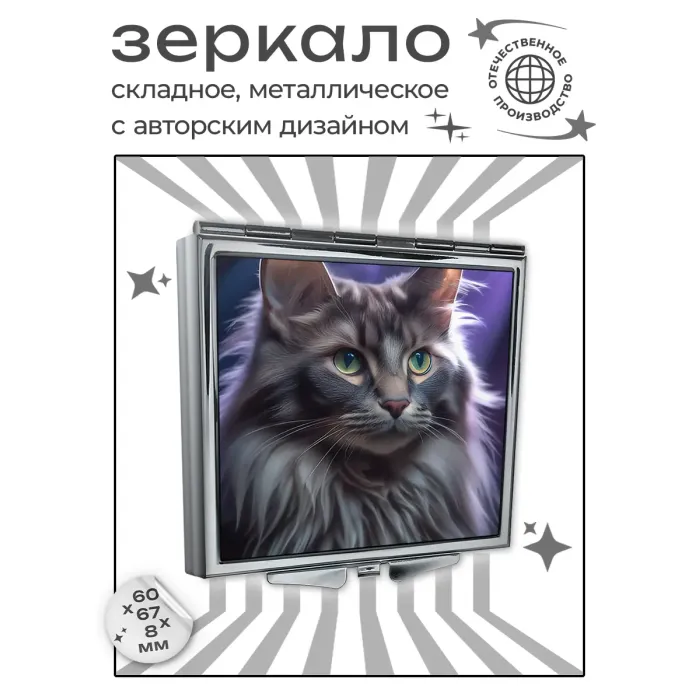 Складное квадратное зеркало с полноцветным изображением кошки. Изготовлено из металла и стекла.