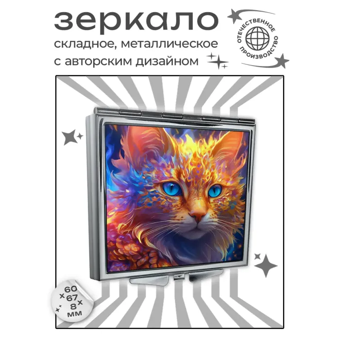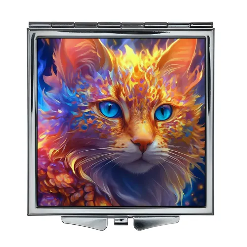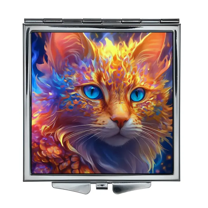 Складное зеркало квадратной формы с изображением кошки в стиле сюрреализма.