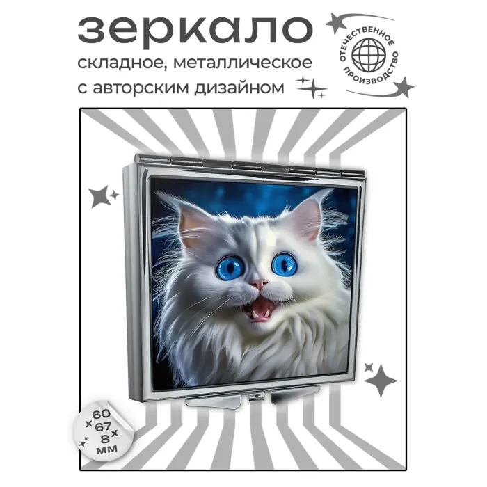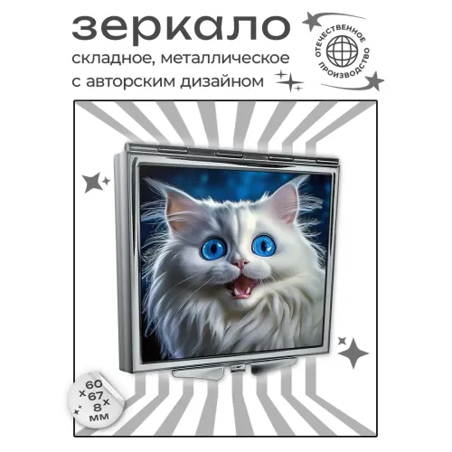 Складное квадратное зеркало для личного использования с изображением кошки. Изготовлено из металла и стекла.