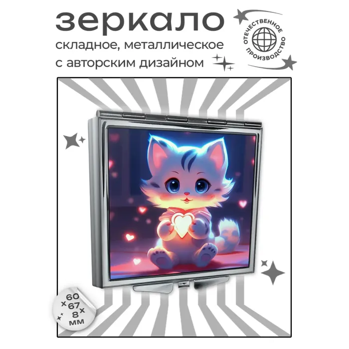 Складное зеркало квадратной формы с изображением кошки и сердца. Изготовлено из металла и стекла.