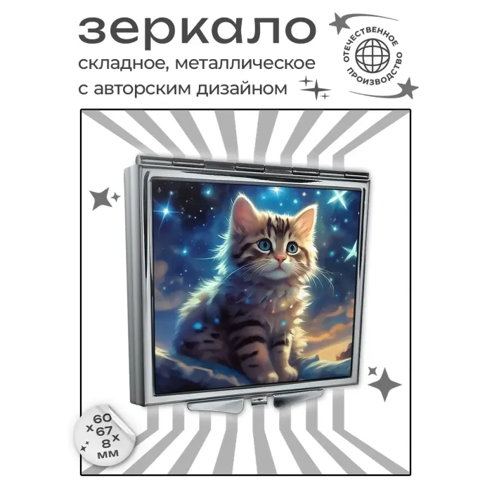 Складное зеркало квадратной формы с изображением котёнка на фоне звёздного неба. Изделие выполнено из металла и стекла.