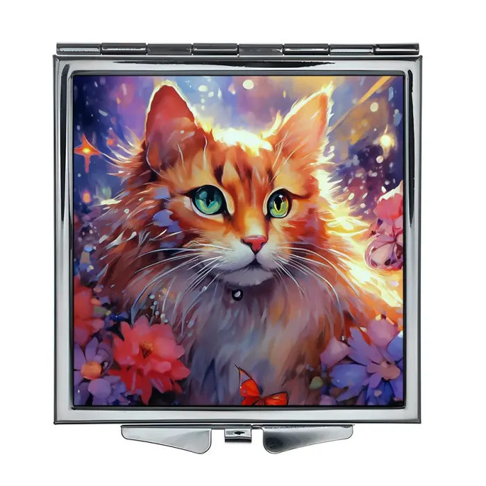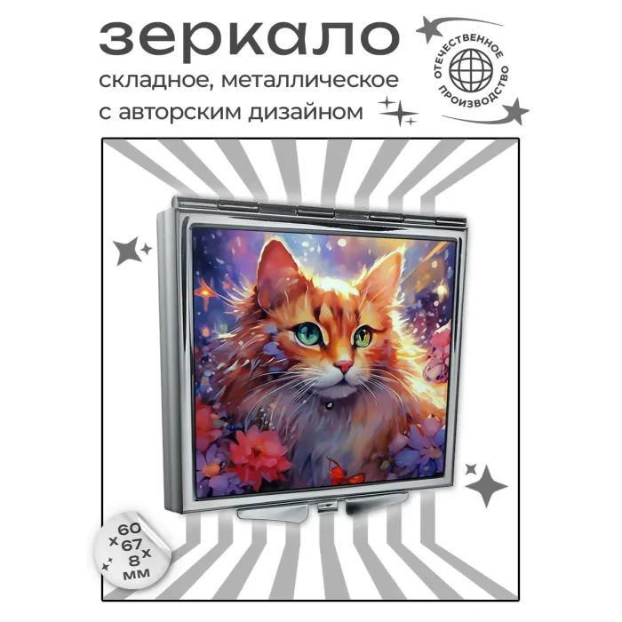 Складное зеркало квадратной формы с изображением рыжей кошки. Изготовлено из металла и стекла.