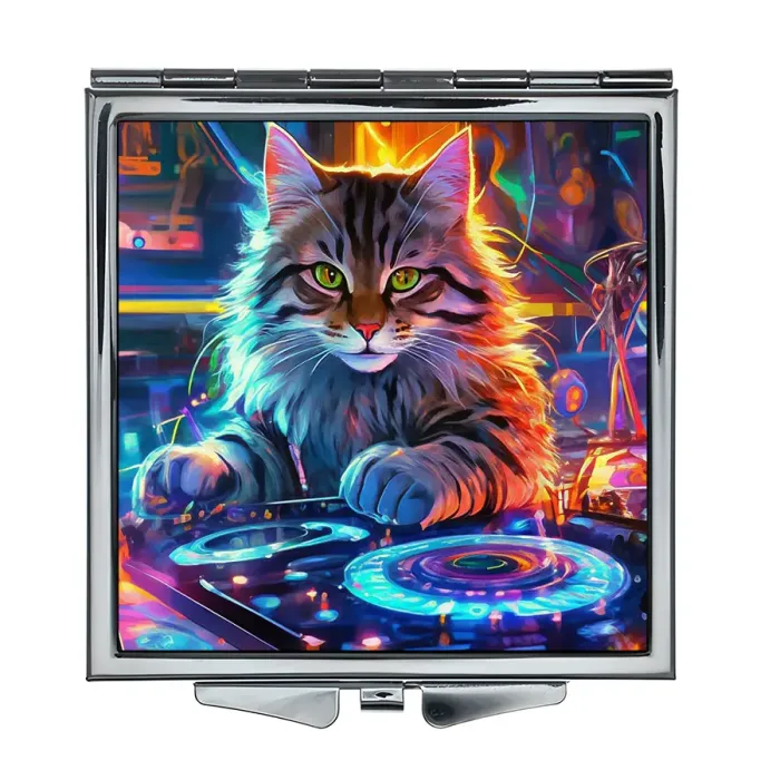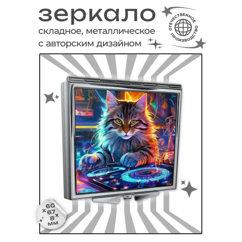 Складное зеркало квадратной формы с полноцветным изображением кота-диджея.