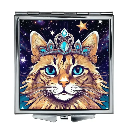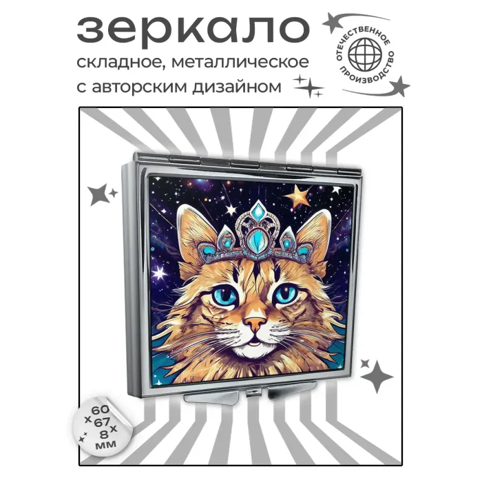 Складное зеркало квадратной формы с изображением кошки в диадеме. Сувенирный аксессуар.