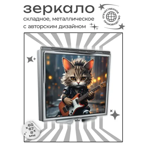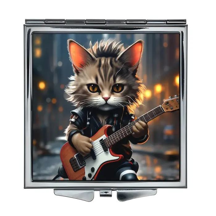 Складное зеркало квадратной формы с изображением кота, играющего на гитаре, станет оригинальным аксессуаром и прекрасным подарком. Это изделие сочетает в себе стильный дизайн и практичность, идеально подходя для использования в путешествиях или повседневной жизни.
