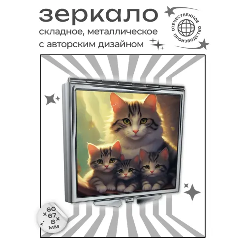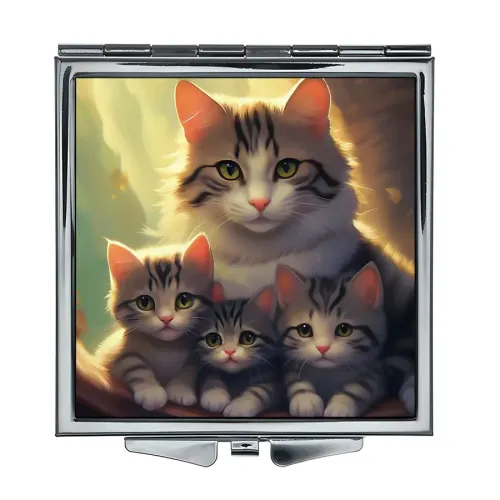 Складное зеркало квадратной формы с изображением «Кошачья семья» для личного использования.