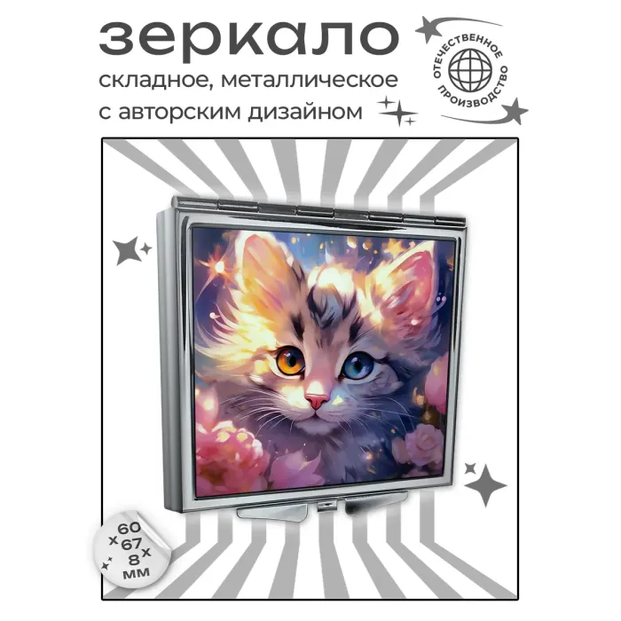 Складное квадратное зеркало с изображением котёнка и роз.
